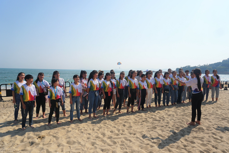 彝族苗族團(tuán)的孩子們還在沙灘合唱了《大海啊,故鄉(xiāng)》《同一個夢想》等歌曲,他們悠揚(yáng)的歌聲伴著海浪,引來許多游客駐足傾聽。